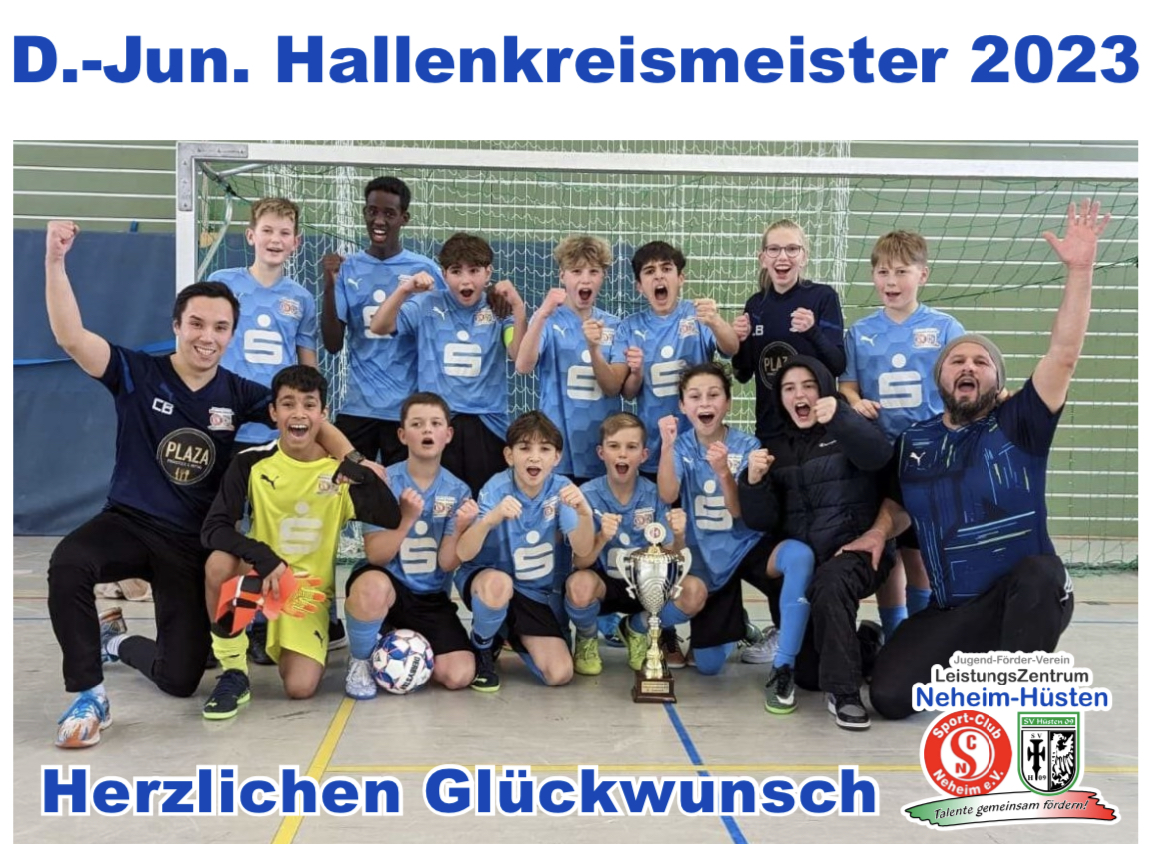 Die D1 des Jugend-LeistungsZentrum Neheim-Hüsten gewinnt am Sonntag, 22.01.2023 den 1. Hallenkreismeister-Titel der noch jungen Vereinsgeschichte. In der Endrunde der Arnsberger HKM 2023 traten sogar beide D-Jun. Teams an. Unsere D2 (U12) belegte einen tollen 4. Platz. Der von Dirk König und Matthias Eber trainierte Spitzenreiter der Arnsberger U13 Kreisliga A, musste sich erst im Spiel um Platz 3 dem Bezirksligisten aus Sundern geschlagen geben. Die D1 stand im Endspiel gegen das Team der SG Balve Garbeck und siegte Souverän mit 5:1. Das von Christoph Burg und Selcuk Yilmaz trainierte Team belohnt sich damit für eine bislang gute Saison mit dem 1. Titel. Wir gratulieren beiden Mannschaften zum tollen Erfolg!