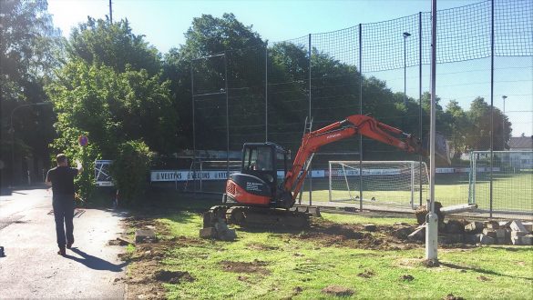 Das gilt auch für das dritte Projekt, an dem derzeit massiv und intensiv gearbeitet wird. Neben dem Haupteingang entsteht ein „multifunktionales“ Minifeld mit Kunstgrün. Hier können sich unsere Jüngsten tummeln und an ihren technischen Fähigkeiten arbeiten. Torwarttraining ist ebenso möglich wie das Warmlaufen vor den Spielen. „Auch dieses Projekt bedeutet eine erhebliche Aufwertung unserer zukunftsorientieren Anlage“, erklärt Tua Schweineberg.