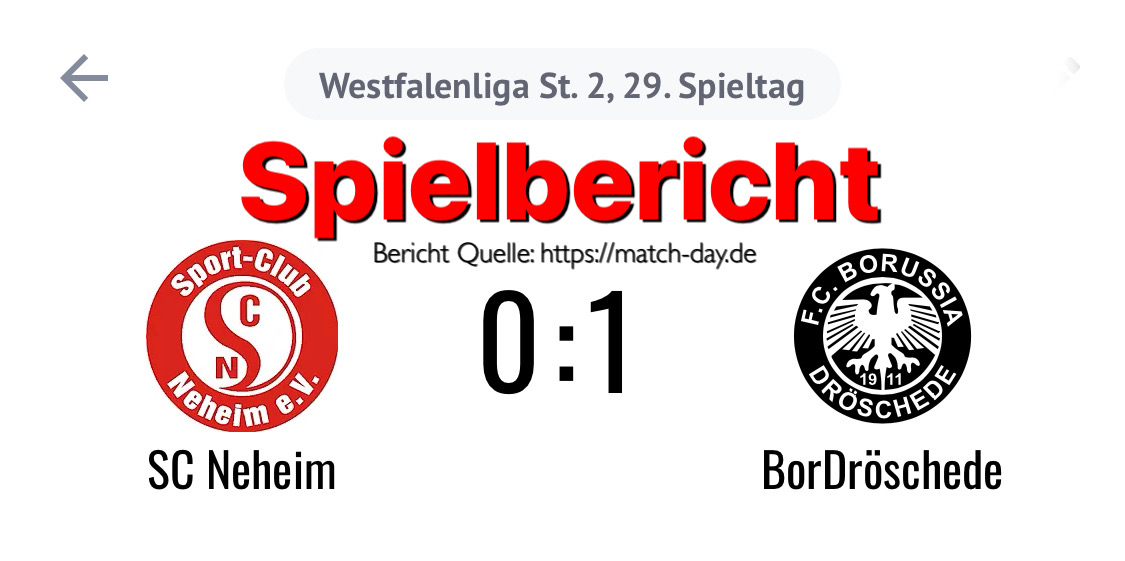 Nach zwei Siegen in Folge wollte der SC Neheim seine englische Woche in der Westfalenliga Staffel 2 mit einem Heimsieg gegen Dröschede krönen und wusste sich dabei gegen einen Gegner, der seit einem halben Jahr keinen Sieg mehr eingefahren hatte, auch immer wieder Chancen zu erarbeiten. Bereits nach neun Minuten hatte Johannes Thiemann das 1:0 für die Hausherren auf dem Fuß, setzte die Kugel aber knapp am Kasten vorbei.